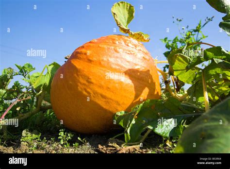 Worms eye view of a row of orange pumpkins in a green grass field Stock from www.alamy.com